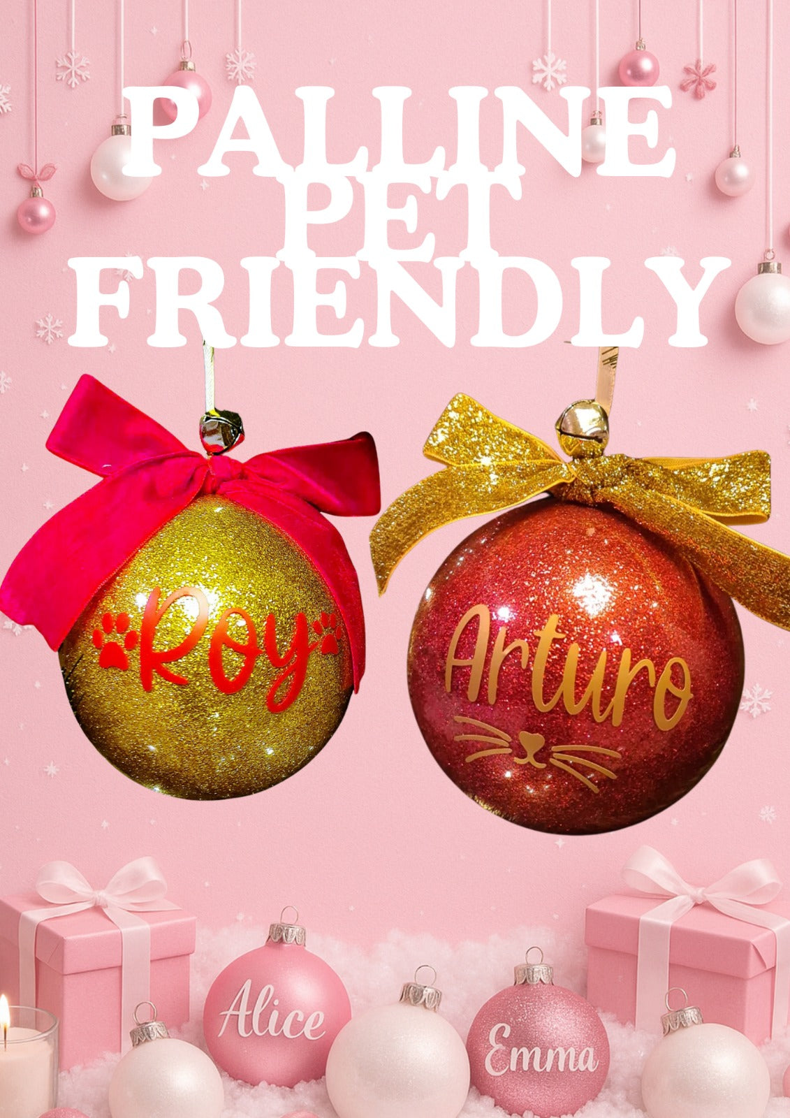 -Colore della Pallina-Colore della scritta-Frase-Fiocco-Cane o Gatto-